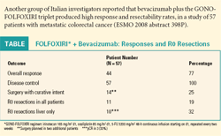 Is the combination of a biologic and a triplet even more effective? “This is a promising approach but still experimental,” according to Dr. Falcone. In the Gruppo Oncologico del Nord Ovest (GONO) study, Dr. Falcone’s group observed significantly higher response rates (60% vs 34%), significantly greater resectability (15% vs 6%), significantly longer progression-free survival (9.9 vs 6.9 months), and significantly greater overall survival (23.6 vs 16.7 months) for patients receiving FOLFOXIRI, as compared with FOLFIRI. Other studies are validating the use of FOLFOXIRI plus bevacizumab to increase resectability (see Table).