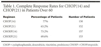 The two trials had the same objectives, though with different age groups: to improve treatment results in patients with aggressive NHL by shortening treatment intervals and/or adding CHOP to etoposide. Among the group of 18- to 60-year-olds, CHOEP (CHOP plus etoposide) achieved the objective. Among the group of 61- to 75-year-olds, shortening the time interval between CHOP treatment courses from 3 to 2 weeks achieved the objective. Michael G. Pfreundschuh, MD, of Medizinische Klinik I, Universität des Saarlands, Homburg, Germany, reported the results at the 43rd Annual Meeting of the American Society of Hematology.