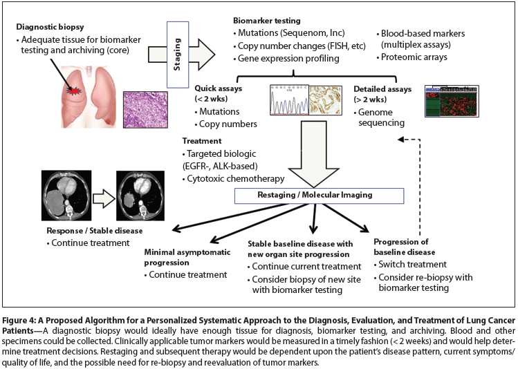 As the rapid evolution of genome technology coupled with a fall in sequencing costs has increased the technical and economic feasibility of complete molecular profiling of a patient’s tumor, molecular diagnostic kits are being developed to guide the use of an increasing number of therapies. The International Cancer Genome Consortium (ICGC) and The Cancer Genome Atlas (TCGA) are examples of large-scale integrative programs whose goal is to harness the full potential of the cancer genome to deliver personalized cancer medicine through multidisciplinary programs. To get closer to our goal of personalized medicine, we suggest a potential approach to patient care (Figure 4). The aim will be to establish a consistent and robust validation workflow of the discovered genomic abnormalities with next-generation sequencing analysis, to enable real-time predictive targeted patient therapy by analyzing tissue specimens and circulating tumor cells (CTCs) for molecular markers in a Clinical Laboratory Improvement Amendments (CLIA)-certifiable manner. A number of different platforms include high-throughput mutation analysis and quantitative-PCR methodologies. Studies such as the Biomarker-integrated Approaches of Targeted Therapy for Lung Cancer Elimination (BATTLE) trial have highlighted the feasibility and value of obtaining more patient specimens and subsequently planning for discovery of new markers correlated with clinical outcome.[76] The schema not only underscores the obvious importance of initial tissue acquisition leading to biomarker testing, but it also shows the importance of considering rebiopsy at the time of progression. Although rebiopsy is not currently a standard practice in patients with lung cancer, we propose that this should be considered more frequently, as it is clear that lung cancer is not a homogenous entity and that any histologic change, or any change in mutational status, could lead to the gains or losses of new therapies for our patients. We have recently reported up to 25% changes in mutational status (gains and losses) in tissue treated with chemotherapy compared with baseline.[77]