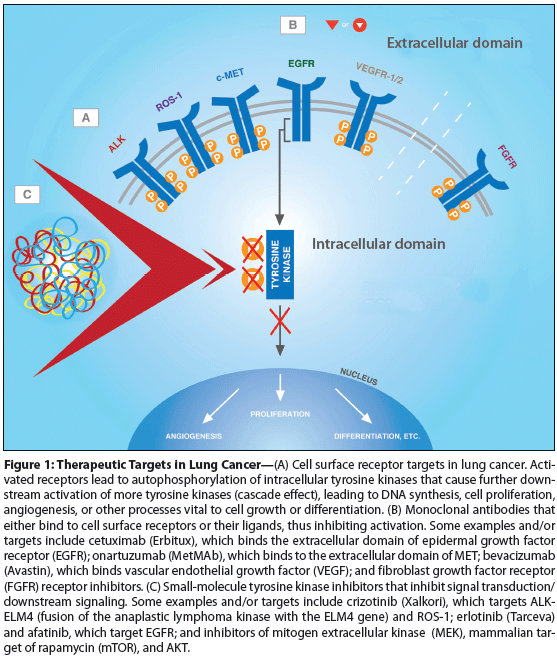 Especially in the last several years, significant advances have been made in personalized chemotherapy choices, based on histology and on the availability of targeted agents that are effective and less-toxic options for lung cancer patients. The first of these targeted agents was bevacizumab (Avastin), a humanized monoclonal antibody directed at vascular endothelial growth factor (VEGF), which was associated with an improvement in overall survival (OS) in non–small-cell lung cancer (NSCLC) when added to carboplatin and paclitaxel.[1] With the success of bevacizumab as a model, newer therapies are constantly being investigated, and this review aims to provide an overview of current practice, with insights into future management. (Figure 1 highlights some current and emerging targets and targeted therapies in lung cancer.)