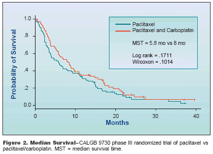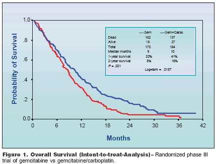 NEW ORLEANS-"Inmetastatic non-small-cell lung cancer,two agents are better than one aslong as one of the agents is a platinumcompound; three drugs are no betterthan two drugs; and carboplatin andcisplatin are similar," according toAlan Sandler, MD, associate professorof medicine at Vanderbilt Universityand director of thoracic oncologyat the Vanderbilt-Ingram CancerCenter.Dr. Sandler spoke at a satellite symposiumheld in conjunction with the44th Annual Meeting of the AmericanSociety for Therapeutic Radiology andOncology (ASTRO). His presentationhighlighted newer combination therapiesas well as chemotherapeutic optionsfor elderly patients and molecularlytargeted agents used in thetreatment of non-small-cell lung cancer(NSCLC).ECOG 1594Dr. Sandler discussed the use ofnewer agents in combination with aplatinum agent for the treatment ofpatients with NSCLC. The results of alarge randomized trial conducted bythe Eastern Cooperative OncologyGroup, ECOG 1594, which comparedgemcitabine (Gemzar)/cisplatin (Platinol),docetaxel (Taxotere)/cisplatin,and paclitaxel/carboplatin (Paraplatin)to the reference arm of paclitaxel/cisplatin, demonstrated no significantdifferences in response rates.Patients who received the gemcitabineand cisplatin regimen, however,demonstrated a significant increasein time to disease progression(4.2 months vs 3.4 months for paclitaxel/cisplatin; P = .001). Dr. Sandlernoted that there was a measurable2-year survival with these regimensthat had not been observed previouslywith combinations of platinums andother agents. Gemcitabine/cisplatindemonstrated the highest 1- and 2-year survival rates (33% and 11%,respectively), but these results werenot statistically significant.Single-Agent vsTwo-Drug CombinationDr. Sandler also addressed whethera single newer third-generation agentwould be just as effective as a twodrugcombination regimen. Data fromthree randomized trials were presentedat the 2002 Annual Meeting of the American Society of Clinical Oncology(ASCO). In these trials, gemcitabine/carboplatin was compared withsingle-agent gemcitabine; paclitaxel/carboplatin was compared with single-agent paclitaxel; and docetaxel/cisplatin was compared with singleagentcisplatin.Gemcitabine/carboplatin was theonly combination that demonstrateda statistically significant difference inoverall survival, compared with single-agent therapy. In this study, gemcitabine/carboplatin produced median,1-year, and 2-year survival of 10months, 41%, and 16%, respectively,compared with 9 months, 32%, and5%, respectively (P = .001), for singleagentgemcitabine (Figure 1)."These three studies," Dr. Sandlerconcluded, "emphasize the fact thatdoublet therapy is in fact better thansingle-agent therapy, and that platinum-based therapy remains the standardof care."Three DrugsNo Better Than TwoGiven the increased efficacy ofsome doublet combination regimensover single-agent therapy, investigatorshave examined whether the additionof a third agent would furtherimprove outcomes. "When you actuallyput it to the test of a randomizedstudy," said Dr. Sandler, "the answer isno, three drugs are not better thantwo-drug regimens."In the first of two randomized trialspresented, gemcitabine/cisplatin wascompared with a three-drug regimenof gemcitabine/cisplatin/vinorelbine(Navelbine). Overall response rate(43.4% vs 38.6%) and median survival(8.7 months vs 7.9 months) wereboth higher with the gemcitabine/cisplatinregimen vs the gemcitabine/cisplatin/vinorelbine regimen.In the second trial, which comparedgemcitabine/carboplatin withMIP (mitomycin [Mutamycin], ifosfamide[Ifex], and cisplatin), the combinationof gemcitabine and carboplatinresulted in a statisticallysignificant increase in median survival,compared with MIP (10 months vs6.5 months, respectively).Carboplatin vsCisplatin SimilarThe relative effectiveness of carboplatinvs cisplatin in the treatment ofpatients with NSCLC has been controversialsince carboplatin was firstintroduced. Two randomized phaseIII trials in patients with stage IIIB orIV NSCLC have recently been completedthat address this issue.In the first trial (TAX 326), patientswere randomly assigned to receivedocetaxel/cisplatin, docetaxel/carboplatin,or vinorelbine/cisplatin. Mediansurvival was 10.9 months in thedocetaxel/cisplatin arm, comparedwith 10.0 months in the control arm ofvinorelbine/cisplatin (P = .122).Median survival in the docetaxel/carboplatin arm was 9.1 months, whichwas not significantly different fromthe control arm. One-year survival was47% in the docetaxel/cisplatin arm,38% in the docetaxel/carboplatin arm,and 42% in the vinorelbine/cisplatinarm. The study was not designed todirectly compare the docetaxel/cisplatinregimen with docetaxel/carboplatin,but to compare each of thesearms with vinorelbine/cisplatin.In a second phase III trial, gemcitabine/cisplatin was compared withgemcitabine/carboplatin. Reported responserates and time to disease progressionwere 47% and 6.1 months,respectively, in the gemcitabine/carboplatinarm compared with 48% and5.6 months in the gemcitabine/cisplatinarm. On the basis of identicalmedian survival (8.1 months in eacharm), Dr. Sandler concluded that thisstudy suggests cisplatin and carboplatinare equivalent when combinedwith gemcitabine in the treatment ofpatients with NSCLC.