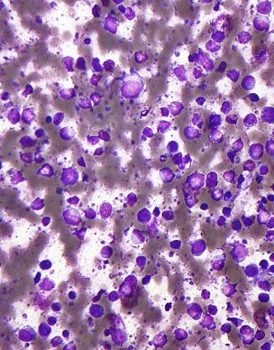 Micrograph of DLBCL, lymph node FNA specimen, field stain; source: Nephron, Wikimedia Commons