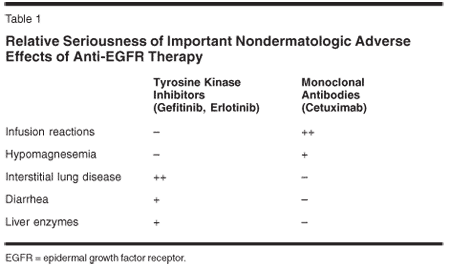 The dermatologic effects of drugs that inhibit epidermal growth factor receptor (EGFR) signaling have received much attention, primarily because they affect nearly all treated patients and are the most visible adverse events,[1,2] and because they may be a marker of antitumor activity.[3,4] These effects, however, are not life-threatening, are manageable, and typically resolve after treatment. However, some nondermatologic adverse events associated with anti-EGFR therapy can also be characteristic, if not as common as skin manifestations. These toxicities are rarely severe, but they may have fatal outcomes if not managed appropriately.