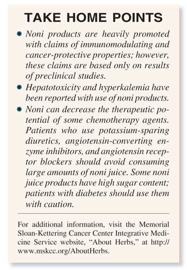 Noni is an evergreen plant prevalent in Southeast Asia, Australia, and the Polynesian islands. It is used in traditional medicine for wound healing, infections, skin conditions, diarrhea, and as a tonic. Noni products have gained worldwide popularity over the past 2 decades and are aggressively marketed for immunostimulation and for treatment of chronic fatigue syndrome and cancer.Preliminary data from in vitro and animal studies suggest immunomodulatory, antioxidant, and antitumor properties. However, hepatotoxicity and hyperkalemia have also been reported with noni use.