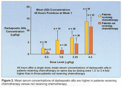 A study with darbepoetin alfa (Aranesp) revealed higher mean serum concentrations in patients receiving chemotherapy than in those not treated with chemotherapy (see Figure 2). "It may be that we’ve been using the substances wrong by giving them on the same days as chemotherapy," Dr. Glaspy said. "We don’t yet know the optimal dose schedules and we argue a lot about the optimal target hemoglobins.’’