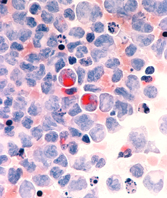 Acute myelocytic leukemia in the pericardial fluid, shown with an esterase stain at 400x