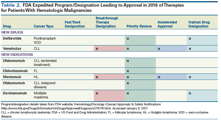 Table 2. FDA Expedited Program/Designation Leading to Approval in 2016 of Therapies for Patients With Hematologic Malignancies