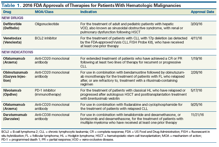 Table 1. 2016 FDA Approvals of Therapies for Patients With Hematologic Malignancies