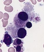 Bone marrow smear from a patient with RAEB and an isolated 5q-chromosome abnormality: megakaryocytes with a nonlobulated nuclei in a myelodysplastic syndrome.