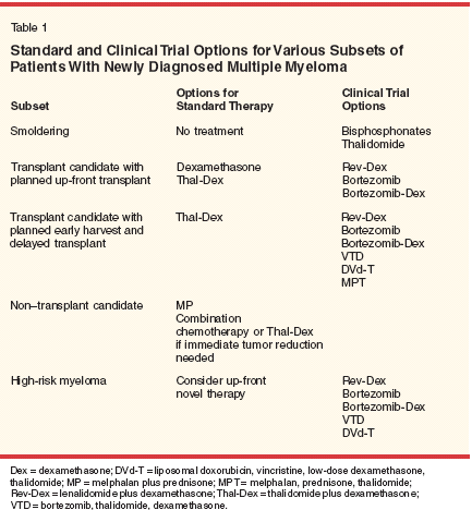 Typical dosing for myeloma is 25 to 30 mg/d on days 1 through 21 of a 28-day cycle. The most common adverse effects are thrombocytopenia and neutropenia. Side effects such as sedation, constipation, and neuropathy appear to be uncommon with lenalidomide. Bortezomib Bortezomib is a boronic acid dipeptide, and the first proteasome inhibitor to enter clinical trials.[24,25] Normally, cellular proteins targeted for destruction are first tagged by the addition of ubiquitin molecules. Ubiquitinated proteins are then identified and degraded in the proteasome complex. Bortezomib is a specific inhibitor of the proteasome complex, and the resultant inhibition of this catabolic pathway leads to cell-cycle arrest and apoptosis. Based on promising preclinical and phase I data, a large phase II study of bortezomib was undertaken in relapsed and refractory myeloma. Of 193 evaluable patients, 27% achieved a significant response to therapy. In another trial, which tested two different dosing schedules, responses were seen in 33% and 50% of patients at the 1.0 mg/m2 (28 patients) and 1.3 mg/m2 (26 patients) dosing levels, respectively.[ 26] Preliminary results from a large randomized trial indicate superior time to progression and overall survival with bortezomib compared to dexamethasone in relapsed, refractory myeloma.[27] The starting dose is 1.3 mg/m2 given on days 1, 4, 8, and 11 every 21 days. The most common side effects are gastrointestinal, cytopenias, fatigue, and peripheral neuropathy. Incorporation of New Agents Into the Treatment of Myeloma The treatment of myeloma usually consists of various phases, such as induction, consolidation-typically with ASCT-maintenance, and treatment of relapsed and refractory disease. Clinical trials incorporating these new agents have been designed to address each phase of therapy. Further, trials are ongoing in specific subsets of patients, including those felt not to be transplant candidates because of advanced age or poor performance status, and those felt to have high-risk myeloma. Studies are also ongoing in patients with smoldering myeloma in an attempt to delay progression to symptomatic disease. Newly Diagnosed Myeloma Patients with newly diagnosed myeloma are treated based on whether they are candidates for ASCT, because two published randomized trials have shown that ASCT prolongs survival in myeloma.[28,29] Patients who are candidates for ASCT need to avoid alkylator-based induction to prevent stem cell damage. Four cycles of vincristine, doxorubicin (Adriamycin), and dexamethasone (VAD) had been the typical induction regimen used in this population of patients. But VAD had significant disadvantages, including the need for an indwelling intra-venous line, neurotoxicity from vincristine, cardiotoxicity from doxorubicin, and alopecia. Furthermore, vincristine and doxorubicin have negligible antimyeloma activity as single agents, and most of the efficacy of VAD is derived from dexamethasone alone. These facts, coupled with the significant activity of oral Thal-Dex in newly diagnosed myeloma, have negated the need for VAD as induction therapy. Preliminary results of a randomized trial show superior response rates with Thal-Dex compared to dexamethasone alone. But Thal-Dex is complicated by a higher incidence of grade 3/4 adverse effects than dexamethasone alone. This is especially true of deep-vein thrombosis, for which prophylaxis should be considered in all patients started on Thal- Dex. So how do we decide on the best induction therapy in standard practice outside a clinical trial setting? The main standard and clinical trial options for patients with various subcategories of newly diagnosed myeloma are summarized in Table 1. After considering the risks and benefits for patients proceeding to early transplant, dexamethasone alone may be adequate pretransplant induction if a delay of 1 to 2 months to assess response can be safely incurred, with the plan of adding thalidomide if response is inadequate. Thal-Dex can be reserved for those patients with more aggressive disease such as painful symptoms, large lytic lesions, impending cord compression, hypercalcemia, or renal failure. On the other hand, dexamethasone alone may not be adequate if an early transplant is not planned. Several ongoing trials are seeking to improve upon results with dexamethasone and Thal-Dex for these patients. Lenalidomide plus dexamethasone (Rev-Dex) is being tested in large randomized trials by the Eastern Cooperative Oncology Group (ECOG) and the Southwest Oncology Group (SWOG) in an attempt to improve efficacy and reduce toxicity. Preliminary results from a phase II Mayo Clinic trial indicate response rates greater than 80% with Rev-Dex in newly diagnosed myeloma, with fewer toxicities than previously observed with Thal-Dex.[30] This strategy is particularly appealing to patients who are proceeding to an early transplant and wish a safe and convenient oral induction regimen. Bortezomib alone appears to be active in newly diagnosed myeloma.[ 31,32] The addition of bortezomib to Thal-Dex seems to greatly improve overall and complete response rates,[33] and will appeal to patients and physicians who seek alternatives to transplant as initial therapy, relegating ASCT to a salvage role. All of these strategies are currently in the clinical trial stage and patients should be encouraged to participate in these trials as much as possible in preference to off-study therapy. For the subset of patients not considered to be transplant candidates because of advanced age or poor performance status, advances have been harder to come by. Melphalan (Alkeran) and prednisone (MP) has remained the standard initial treatment for this group for over 3 decades. Ongoing trials are seeking to improve upon this by adding new agents to the classic MP regimen. The addition of thalidomide to MP increased response rates and prolonged progression-free survival in two recent trials; however, no improvement 