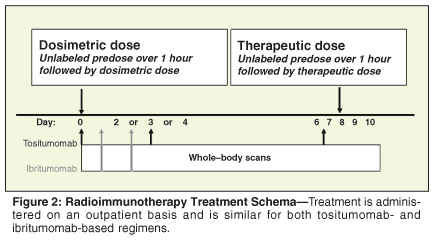 The treatment regimen is administered on an outpatient basis and is similar for both RITs (Figure 2). Initially, a nonradiolabeled antibody is administered to allow for binding of circulating lymphocytes to minimize toxicity and to maximize localization of the RIT to the lymphoma disease sites. Rituximab is used for ibritumomab, and unlabeled tositumomab is used for I-131 tositumomab. Then a "dosimetric," low dose of the RIT is given to determine individual total-body clearance of the constructs.