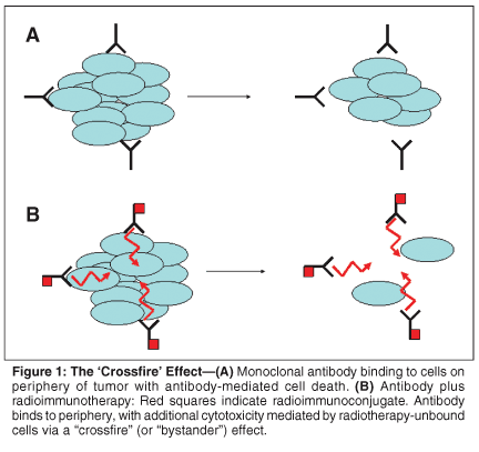 To augment the effectiveness of the CD20 antibody, radioimmunoconjugates have been developed.[9,10] These constructs combine the selectiveness of the CD20 antibody with the additional cytotoxicity of radiotherapy. Even if a tumor is bulky or portions lack CD20 expression, the targeted radiation will cause cytotoxicity-ie, the "bystander" effect-while limiting undesirable nonspecific radiation (Figure 1).[11] In 2002, yttrium-90 ibritumomab tiuxetan (Zevalin) became the first radioimmunotherapeutic agent (RIT) approved by the US Food and Drug Administration (FDA) for the treatment of relapsed or refractory low-grade lymphoma including transformed phenotypes. Y-90 is primarily a beta-particle emitter with a relatively long path length (5-10 mm), and as such, has been postulated to work better on penetrating bulky tumors. This isotope also has a favorable half-life of only 2.5 days. The Y-90 is bound to a linker tiuxetan, which is then bound to the antibody.