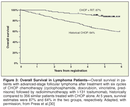 Gordon and colleagues have demonstrated that durable responses, similar to those observed by Fisher and colleagues with I-131 tositumomab, may also occur after treatment with ibritumomab tiuxetan.[20] Approximately 24% of responding patients had a time to progression of more than 3 years, including long-term responders with remission durations exceeding 5 years.