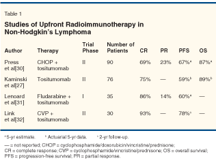 Recent studies have suggested that RIT works best earlier in the treatment continuum and may have particular utility as upfront therapy in follicular lymphoma, especially when combined with chemotherapy. Active multicenter clinical trials continue to enroll patients to determine the optimal timing of RIT in indolent NHL and to confirm observations of activity in aggressive subtypes. RIT has also proven to be a safe and effective agent for conditioning regimens in autologous transplant regimens for B-cell NHL. Hopefully, mature results of these clinical trials will define the optimal use of RIT and increase the numbers of patients who benefit from these highly active agents.