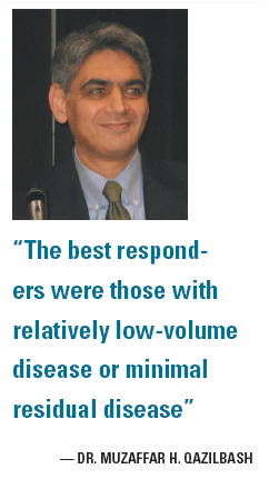 Four of the 13 patients in complete remission have experienced long-term remission for a median of 30.5 months (range, 11 to 59 months). Immune responses have been maintained for as long as 4 years in some patients. “The best responders were those with relatively low-volume disease (< 10% of leukemia blasts in the marrow) or only minimal residual disease as measured by cytogenetic and molecular analyses,” Dr. Qazilbash said.