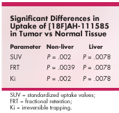 In the advanced breast cancer patients, the combination of PET and CT imaged 18 of 19 lesions. Uptake of the tracer was seen throughout the tumor or in the circumference of the lesion. The differences between uptake in tumors vs corresponding normal tissues were highly significant for nonhepatic lesions (see Table), she said. Hepatic metastases had low levels of tracer uptake, compared with surrounding normal tissue.