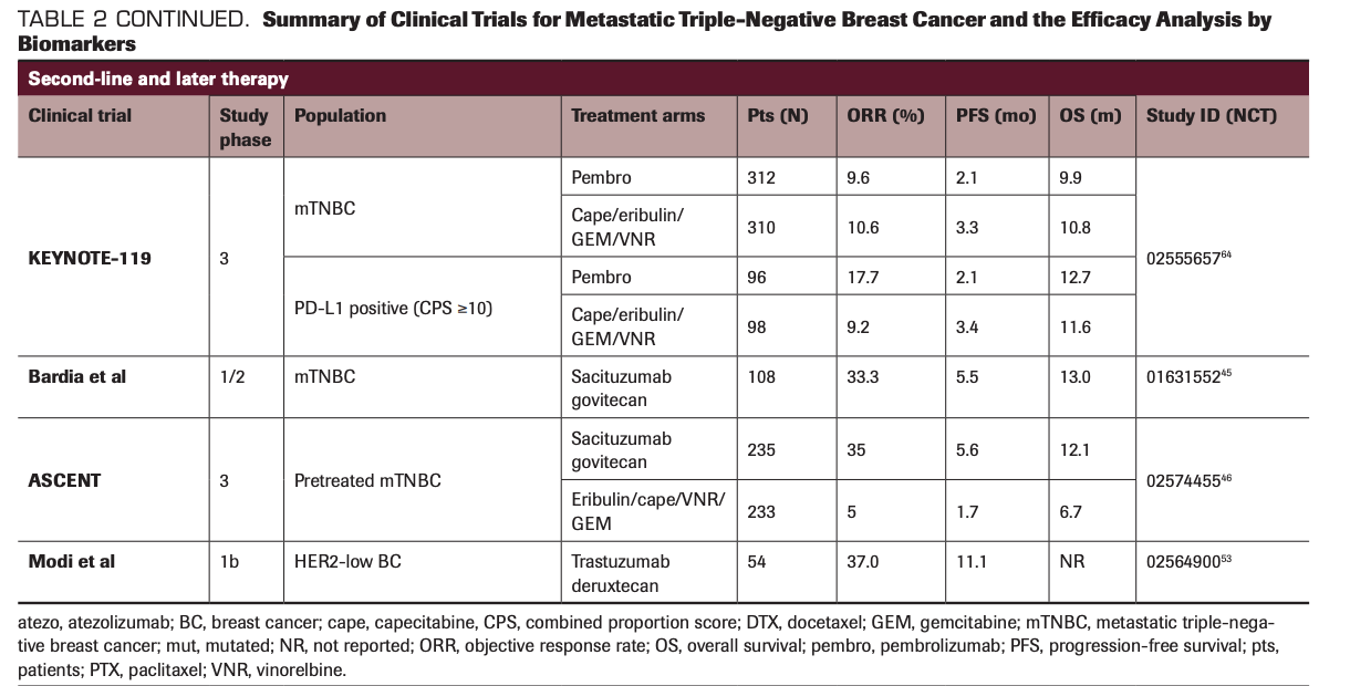 TABLE 2 CONTINUED. Summary of Clinical Trials for Metastatic Triple-Negative Breast Cancer and the Efficacy Analysis by Biomarkers