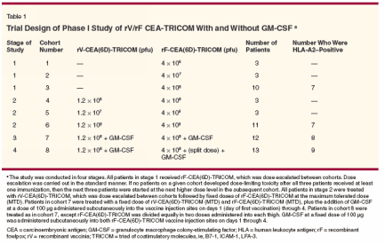 Hodge et al reported that murine cells infected with a recombinant virus expressing genes for three costimulatory molecules (eg, B7.1 [CD80], ICAM-1 [CD54], A-3 [D58] referred to as the TRIad of COstimulatory Molecules [TRICOM]), activated T cells to a far greater extent than cells infected with either one or two of the costimulatory molecules.[61] This was the first experimental evidence that vectors could be used to transfect cells with three costimulatory molecules; in addition, the TRICOM strategy activated both CD8+ and CD4+ cells. Direct intralesional injection of TRICOM into metastatic melanoma has been shown to alter the tumor's microenvironment with a resultant local tumor regression.[62] Subsequently, the gene for CEA has been incorporated along with the TRICOM molecules to provide a single vector that can transfect cells with genetic elements supplying both signals necessary for T-cell activation, thereby amplifying T-cell responses.[ 63-65] With this approach, therapeutic vaccines could alter the phenotype of an infected cell by converting any cell into an antigenpresenting cell expressing both costimulatory molecules and antigen- MHC complexes on its surface. This approach appears to be augmented when the prime-and-boost administration strategy is employed, and is facilitated by coadministration of GMCSF and/or IL-2.[66] Studies by Marshall et al have demonstrated that rV-CEA and fowlpox- CEA (rF-CEA) are well tolerated and have clinical activity with a correlation between CEA-specific immune reactivity and survival.[67,68] The investigators recently published the results of a phase I study of a primeand- boost strategy with rV-CEA/ fowlpox-CEA plus TRICOM in 58 patients with advanced CEA-expressing cancers.[69] Patients were accrued to eight cohorts that involved vaccinations with the following: fowlpox- CEA-TRICOM; primary vaccination with rV-CEA-TRICOM plus fowlpox- CEA-TRICOM booster vaccinations; and rV-CEA-TRICOM and then fowlpox-CEA-TRICOM plus GM-CSF with vaccines, or with divided doses of vaccine with GM-CSF (Table 1). The therapeutic cancer vaccines were administered for six doses at 28-day intervals and then once every 3 months. If, in the judgment of the investigator, patients progressed on the 3-month schedule, they were allowed to revert to 28-day treatment intervals. The vaccines were well tolerated. One patient (2%) had a histologically documented, complete response. Twenty-three patients (40%) had stable disease for at least 4 months, with 14 of these patients having stable disease for 6 months or longer. Eleven patients (19%) had decreasing or stable serum CEA. The ELISpot assay was used to assess interferon-gamma released by peripheral blood mononuclear cells in response to CEA peptide exposure. The majority of the patients demonstrated enhanced CEAspecific T-cell responses. Interestingly, several patients had preexisting CEA-specific T-cell responses prior to vaccination-presumably reflecting an endogenous, but suboptimal, response to their tumor. The investigators concluded that not only is the vaccine well tolerated and able to generate significant CEA-specific immune responses, but the vaccines also appeared to clinically benefit some patients. Addition of MUC-1