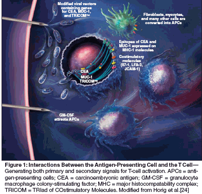 Costimulatory MoleculesT cells require at least two signals for activation. The first is delivered when the antigen binds to the T-cell receptor. The second is a costimulatory signal delivered by receptorligand interactions between the T cell and the antigen-presenting cell (eg, CD28 and B7.1).[59] Binding of CD28 to B7.1 upregulates the production of multiple cytokines by CD8+ and CD4+ cells, including IL-2 and interferon-gamma. Von Mehren et al demonstrated that a fowlpox- CEA B7.1 vaccine was well tolerated and induced CEA-specific T-cell responses in patients with advanced re- current adenocarcinomas.[60] Thus, it was logical to explore the potential of vaccination with multiple costimulatory molecules.