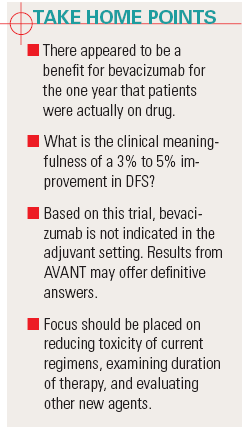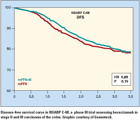 “We found there was a transient but robust benefit in DFS during the one year that bevacizumab was utilized,” he noted. “The magnitude is similar to that seen with trastuzumab (Herceptin) in breast cancer in NSABP B-31. As a matter of fact, we came close to reaching the early stopping boundary for efficacy. So bevacizumab was effective, but this efficacy disappeared after bevacizumab was stopped. The challenge is to learn how to use bevacizumab to its maximum potential in the adjuvant setting.”