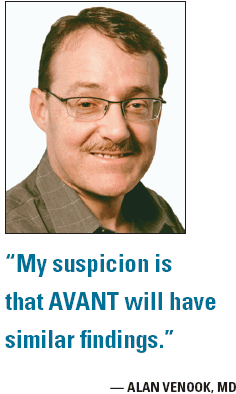Meanwhile, the results raise the stakes even higher for the AVANT trial, which is also evaluating bevacizumab in the adjuvant setting. Dr. Venook is not necessarily convinced that AVANT will change the standard of care anymore than C-08 did. “If AVANT is strongly positive, then you have to square it with a negative study. My suspicion is that AVANT will have similar findings.”