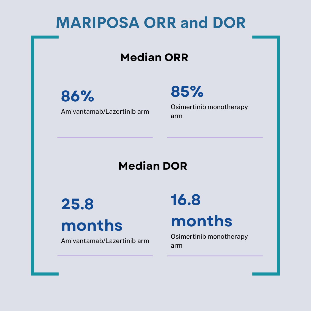Response rate-wise, if we look at the combination, it was 86% for amivantamab plus lazertinib and 85% for osmertinib. The duration of response, however, was longer with amivantamab plus lazertinib at 25.8 months compared with 16.8 months. This is one of the secondary end points. They’re saying that they do the response with amivantamab and lazertinib longer than monotherapy, maybe by controlling some of the disease persister cells and their resistance mechanisms. The most recent update that we had from MARIPOSA, and this is, I believe, the intracranial PFS. The intracranial PFS of amivantamab plus lazertinib was 24.9 months. Osmertinib was 22.2 months, with an HR of 0.82. There is a 3-month benefit from amivantamab plus lazertinib in the brain. Just telling us that we thought we knew so much about the blood-brain barrier, but I don’t think we do.