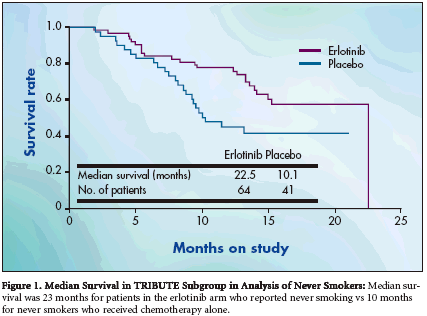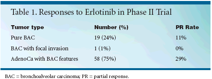 NEW YORK-Non-smallcelllung cancer (NSCLC) patients whohave never smoked gain significantlywhen erlotinib (Tarceva) is added totheir chemotherapy regimens, accordingto two recent studies reported byinvestigators from Memorial Sloan-Kettering Cancer Center (MSKCC).Mark G. Kris, MD, reported datafrom a phase II trial in patients withbronchoalveolar carcinoma (BAC)showing that response to erlotinib wassignificantly higher in nonsmokers andin patients who had adenocarcinomaswith BAC features (abstract 7062). Heand colleagues from MSKCC andVanderbilt-Ingram Cancer Center,Nashville, analyzed pretreatment factorsassociated with radiographic responseafter erlotinib in patients withany BAC features in tumor specimens.Of the 83 patients treated with erlotinib150 mg po daily, 27% hadnever smoked. Among 78 evaluablepatients, 19 (24%) had partial responses(PR). Seven of the responses areongoing, with a range of 1+ to 21+months. Median response duration is12 months.Median patient age was 65 years(range 33-85); 64% were women; and26% had prior chemotherapy. Pathologieswere 24% "pure" BAC, 75% adenocarcinomawith BAC features, and1% BAC with focal invasion.More Likely to RespondResponse correlated with smoking.The PR rate was 45% in never smokersvs 18% in smokers. Patients with verylittle tobacco exposure (1 to 5 packyears) also did well: three of six hadpartial responses. "This suggests themolecular target of erlotinib is lesslikely to be influenced by tobacco exposure,"Dr. Kris said.The 1 year survival is 58% (95% CI44% to 76%). Median survival has notbeen reached."Patients who benefit have adenocarcinomaswith BAC, not pure BAC,"Dr. Kris told ONI (see Table 1). Thosewho had never smoked did better,even within the BAC cohort.