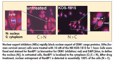 NEIs are direct and specific inhibitors of the nuclear export protein CRM1, which shuttles "cargo" proteins in and out of the nucleus, including proteins that contribute to carcinogenesis. Simply put, NEIs trap tumor suppressors and transcription factors in the nucleus, where they induce cell death (see science box). Tumor cell growth inhibition has been observed in multiple mouse models, said Sarah Mutka, PhD, senior scientist in biology at Kosan Biosciences.