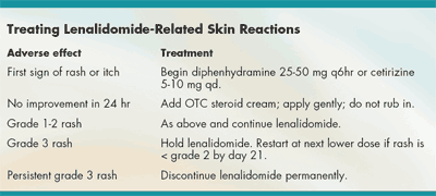 If lenalidomide was interrupted dueto skin problems, prophylactic diphenhydraminewas used when treatment wasresumed and sometimes with subsequentcycles. With this approach, only two ofthree patients who developed grade 3desquamating rash had to stop treatment.
