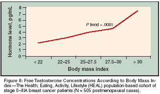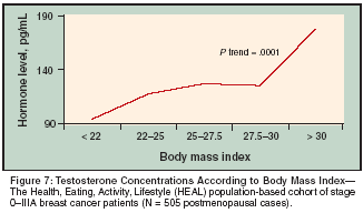 Overweight, obese, and sedentary postmenopausal women have elevated concentrations of circulating total and free androgens, which may be due to increased amounts of 17-betahydroxysteroid dehydrogenase in subcutaneous and intra-abdominal fat. A combined analysis of nested case-control studies within nine cohort studies, which included data from 663 breast cancer cases and 1,765 women without breast cancer, found that postmenopausal women with serum hormone concentrations in the top quintile for testosterone, androstenedione, dehydroepiandrosterone (DHEA), and DHEA-sulfate (DHEA-S) were approximately twice as likely to develop breast cancer compared with women with serum hormones in the bottom quintile.[39] In the same analysis, a doubling of androgen concentration resulted in a 20% to 40% increase in risk for breast cancer. When estradiol and testosterone were included in the same model, the effect of doubling testosterone on breast cancer risk was greater than that of estradiol (RR = 1.32 and 1.18, respectively), and similar results were observed for androstenedione when combined in a model with estradiol. These androgens may increase cell proliferation by being converted to estradiol and estrone in the circulation or target tissue. In addition, androgens may affect breast cancer risk by directly stimulating the growth and division of breast cells. In the HEAL cohort of breast cancer patients, overweight and obese women had statistically significantly elevated levels of testosterone, free testosterone, and DHEA-S (Figures 7 and 8).[40] Levels of DHEA-S and free testosterone were higher in women in the top quartiles for body fat mass compared with the leanest women, although the trend was only statistically significant for free testosterone.
