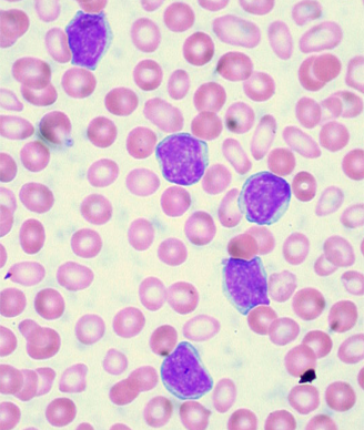 Peripheral blood film from a 70-year-old woman with an absolute lymphocyte count of 41,000/uL; source: Ed Uthman, Wikimedia Commons