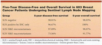 Five-year disease-free survival and overall survival were estimated for each group. At a median follow-up of 44 months, the size of sentinel node metastases was a significant predictor of disease-free survival (