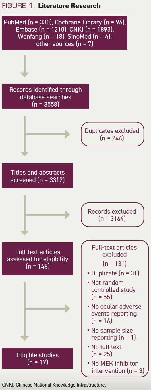 We performed a literature search of PubMed, the Cochrane Library, Embase, the Chinese National Knowledge Infrastructure, Wanfang Data, and Chinese Biomedical Literature from inception to November 11, 2020, with the last review performed on January 1, 2022. Keywords included trametinib, binimetinib, selumetinib, cobimetinib, ocular, and eye. A prospective protocol was created in advance and uploaded to the International Prospective Register of Systematic Reviews (PROSPERO) online platform (registration No. CRD42021235589).