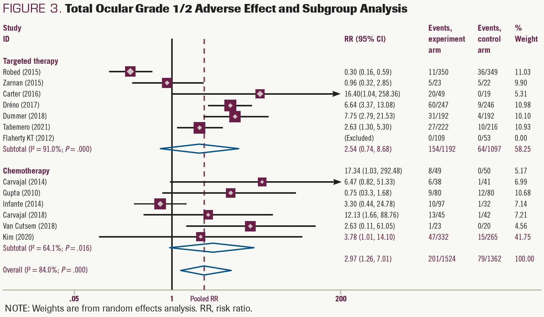The results for grade 3/4 ocular toxicities were similar when pooling in the targeted therapy subgroup (RR, 7.23; 95% CI, 1.04-50.28; P < .05) (Supplement S1). However, the risk-of-chemotherapy subgroup was presented in 1 article and thus could not be pooled effectively.