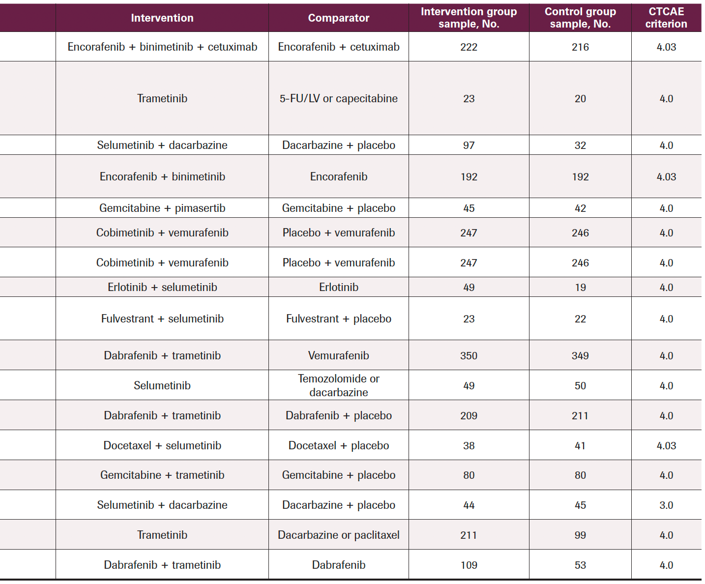 After reading all the text, 17 studies (9 with double-blinded design, 6 with open-label design, 1 with single-blinded design, and 1 with design not mentioned) were included in the final analysis according to the selection criteria, which contained 16 RCTs (Table 1) and the coBRIM clinical trial, which reported secondary end points in 2 studies. Among these studies, 8 were phase 3 and 9 were phase 2, and all included treatment with MEK inhibitors: 3 with a single MEK inhibitor, 9 with a combination of MEK and other targeted inhibitors (such as BRAF inhibitors or epidermal growth factor receptor [EGFR], tyrosine kinase inhibitors, and estrogen antagonists), and 5 with a combination of MEK inhibitors and chemotherapy (such as dacarbazine, gemcitabine, or docetaxel). The MEK inhibitors covered in this study included trametinib, selumetinib, cobimetinib, binimetinib, and pimasertib. In all trials, the pathologic conditions included were colorectal cancer, bladder cancer, melanoma, pancreatic adenocarcinoma, NSCLC, or breast cancer. The criteria used for ocular AE classification was the National Cancer Institute Common Toxicity Criteria for Adverse Events version 3 or 4.