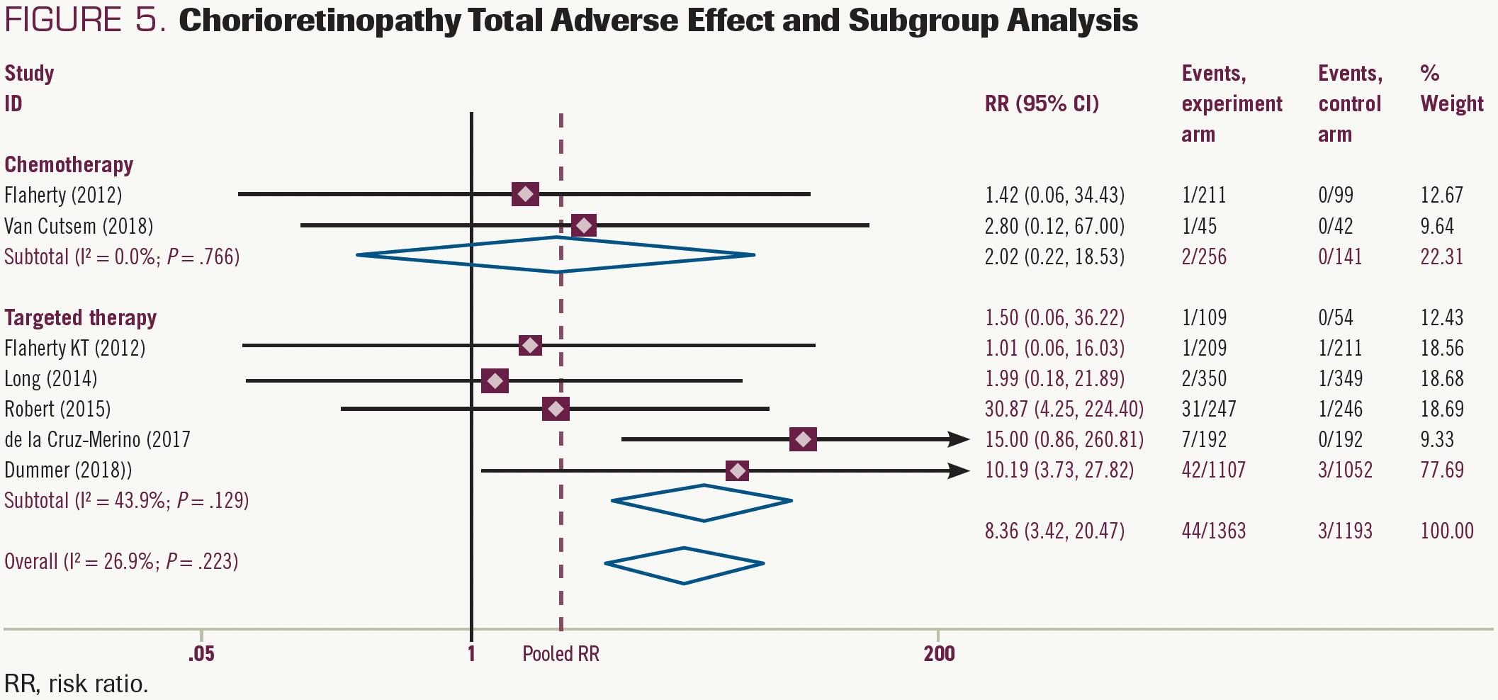 FIGURE 5. Chorioretinopathy Total Adverse Effect and Subgroup Analysis
