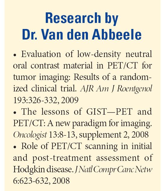 Annick Van den Abbeele, MD, couldn’t believe her eyes. Dr. Van den Abbeele, the chief of radiology at Boston’s Dana-Farber Cancer Institute, had seen the patient just a month earlier. At that time, the 35-year-old woman had a gastrointestinal stromal tumor in her abdomen that was so large, she looked six months’ pregnant. But at the patient’s follow up FDG-PET study, the tumor was completely gone.