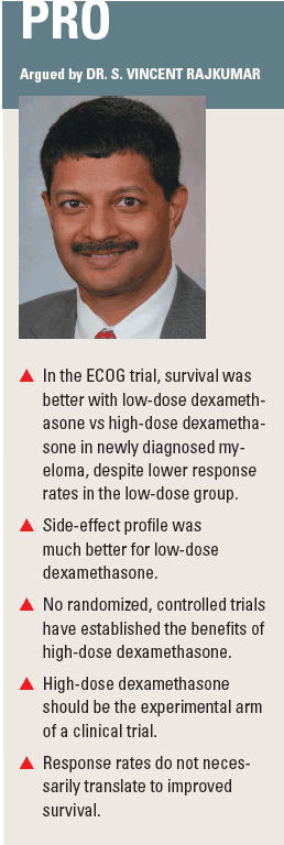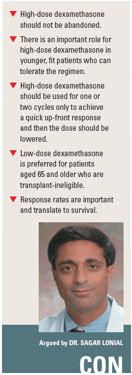 Lead author of the ECOG trial, S. Vincent Rajkumar, MD, professor of medicine at the Mayo Clinic in Rochester, Minn., espouses the benefits of low-dose dexamethasone. Sagar Lonial, MD, associate professor of hematology and medical oncology at Emory University in Atlanta, argues that high-dose dexamethasone should not be abandoned, especially in selected patients.