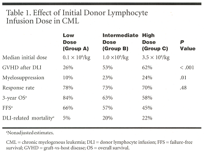 ROMEBest outcomes from donor lymphocyte infusion in chronic myelogenous leukemia (CML) occur when the first dose does not exceed 0.2 × 108 mononuclear cells/kg, Cesare Guglielmi, MD, reported in a presentation at the 43rd Annual Meeting of the American Society of Clinical Oncology.