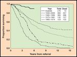At 18 months of therapy, the estimated 5-year survival rate for patients not achieving a complete cytogenetic response was significantly less than for those who achieved a complete cytogenetic response (99% vs 90%; P < .001).[23] The investigators found a continuous improvement in the rate of major molecular response, which rose from 53% at 1 year to 80% at 4 years of therapy (P < .001).[23] This study did not document a survival advantage for imatinib because of the crossover design. Studies comparing the survival of imatinib-treated patients with historical cohorts treated with interferon-alpha-based therapy demonstrated the anticipated survival advantage.[9,24,25] Figure 2 shows the survival of patients treated at M. D. Anderson Cancer Center since 1965 by year of therapy.