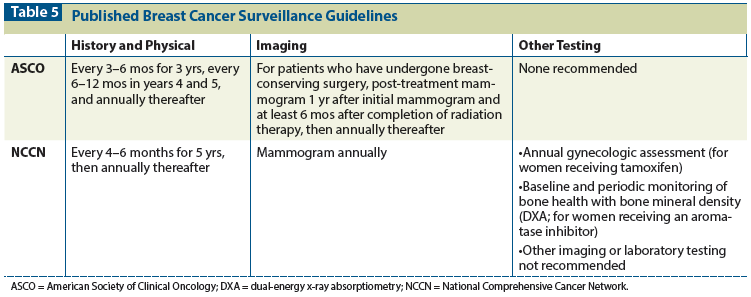 There are more than 3 million breast cancer survivors in the United States alone. The introduction of effective screening and adjuvant therapies has significantly improved survival rates; current 5-year survival rates are near 90%.[54] Despite advances in the management of local recurrence, metastatic disease continues to be a concern; the average survival of patients with metastatic breast cancer is just under 2 years.[55] Detection of asymptomatic breast cancer recurrence carries a more favorable prognosis and, together with poor overall outcomes in the metastatic setting, could be an argument for more intensive surveillance post-treatment, in order to enable earlier detection.[56] The data, though, indicate otherwise. Both NCCN and ASCO surveillance guidelines (Table 5) recommend only clinical visits twice a year for 5 years, along with annual mammography, supporting the conclusion that intensive follow-up with additional imaging studies and routine tumor marker tests does not improve overall survival.[57,58]