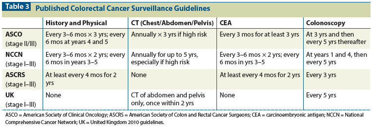 The majority of colorectal cancer survivors undergo post-treatment surveillance, the rationale for which is that early detection of recurrent or metachronous disease amenable to other curative therapies improves survival outcomes. Other reasons include detection for potential use of palliative therapies (even prior to symptom onset) and improvement in overall quality of life. Most surveillance guidelines (Table 3) include a combination of: clinician visits with history and physical examination; imaging; colonoscopy; and laboratory tests, including measurement of the carcinoembryonic antigen (CEA). Current NCCN guidelines for stages I-III colorectal cancer recommend a history and physical examination, along with measurement of CEA every 3 to 6 months for 2 years and then every 6 months for years 3 through 5. Imaging, including CT scanning of the chest, abdomen, and pelvis in select high-risk survivors is recommended annually for up to 5 years, and colonoscopy is recommended in years 1 and 4, and then every 5 years thereafter (or more frequently, depending on colonoscopy findings).[29,30] There is modest variation in the guidelines of other national societies, such as those of the American Society of Clinical Oncology (ASCO; which recommend a shorter duration of surveillance overall [3 years for most studies]) and those of the American Society of Colon and Rectal Surgeons (which make no recommendation for routine imaging unless indicated per symptoms). Interestingly, European societies in general tend to subscribe to a much less intense surveillance program than those commonly used in the United States.[31-33]
