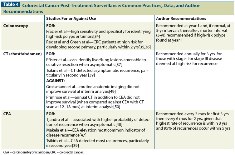 Table 4: Colorectal Cancer Post-Treatment Surveillance: Common Practices, Data, and Author Recommendations