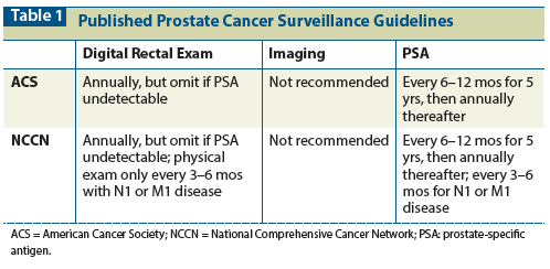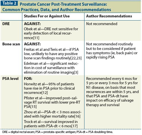 In sum, while there is an obvious need for more standardized, evidence-based surveillance practices in prostate cancer, a reasonable approach to post-treatment surveillance after initial definitive therapy would include a clinician visit, physical examination, and measurement of PSA level every 6 months (with imaging and DRE used only in patients with rapid PSA rises or symptoms). In patients with N1 disease, measurement of PSA level every 3 months would be appropriate. Given that most recurrences occur within 5 years of the completion of treatment, this duration would be reasonable. After 5 years, the decision of whether to continue annual PSA testing should be based on patient age, comorbidities, and life expectancy (Table 2).