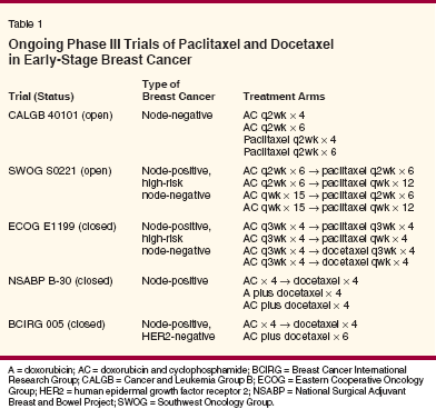Furthermore, dose-dense therapy was not associated with greater toxicity, and the incidence of grade 4 neutropenia was greater in the every- 3-week sequential arm than in the two dose-dense arms (24%-43% for the every-3-week regimen vs 3%-9% for dose-dense therapy).[43] Platelet transfusions were not required in any patients, but red blood cell transfusions were required in 13% of patients in the concurrent dose-dense arm and in 3% of those in the every-3-week arm. An interim analysis of 89 patients (135 enrolled) treated with dose-dense therapy found that darbepoetin alfa (Aranesp), given at 200 ?g when the hemoglobin level dropped to less than 12 g/dL and administered thereafter according to a preplanned algorithm, eliminated the need for red blood cell transfusions.[44] The results of two European trials of dose-dense epirubicin-based regimens have been disappointing. Venturini and colleagues conducted a phase III trial in 1,214 patients with node-positive or high-risk node-negative operable breast cancer who were randomized to six cycles of FEC (600/60/600 mg/m2) at either 2- or 3-week intervals with G-CSF.[45] There were no significant differences in survival. In the neoadjuvant setting in patients with locally advanced breast cancer, survival with doseintense EC (120/830 mg/m2) given with G-CSF every 2 weeks for six cycles was no greater than that with FEC (500/60/75 mg/m2) given every 4 weeks for six cycles.[46] These data suggest that dose density may be more important with the taxanes than with other drugs. The benefits seen with dose density should not be extrapolated to untested regimens. Another strategy used with the taxanes is weekly regimens. A regimen of weekly paclitaxel was found to have greater efficacy than an every-3-week regimen, especially in metastatic disease.[ 47,48] The benefits of weekly paclitaxel in the neoadjuvant setting have also been shown: In a study in 258 patients with operable breast cancer, the response rate with preoperative weekly paclitaxel followed by FAC was double that with standard paclitaxel followed by FAC (29% vs 14%; P < .01).[47] The value of weekly paclitaxel as adjuvant therapy continues to be investigated and should be determined in ongoing trials. ECOG 1199, a randomized four-arm trial is comparing paclitaxel and docetaxel given either weekly or every 3 weeks after four cycles of AC. In another 2 * 2 trial design, SWOG S0221 will evaluate AC (weekly or every 2 weeks) followed by paclitaxel (weekly or every 2 weeks). The ongoing Intergroup S0221 trial is the only trial that is comparing weekly and every-2- week paclitaxel in the adjuvant setting. These data support the importance of delivering full chemotherapy doses on schedule. Dose reductions and delays, however, are common in clinical practice,[49,33,34] and when substantial, may affect outcomes. Clinicians should therefore avoid dose reductions whenever possible and should attempt to maintain the dose and schedule of the regimens that have been established in clinical trials.New Agents and Biologics