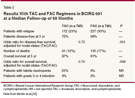 30. Nabholtz J, Pienkowski T, Mackey J, et al: Phase III trial comparing TAC (docetaxel, doxorubicin, cyclophosphamide) with FAC (5- fluorouracil, doxorubicin, cyclophosphamide) in the adjuvant treatment of node positive breast cancer (BC) patients: Interim analysis of the BCIRG 001 study (abstract 141). Proc Am Soc Clin Oncol 21:36a, 2002.