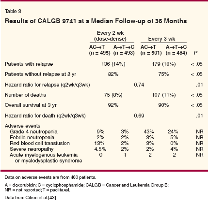 Dose intensification can be achieved not only by increasing the dose intensity (increasing the dose of the drug per cycle) but also by increasing the dose density (decreasing the interval between the cycles while keeping the dose of the drug the same).[38] Mathematic models of tumor growth predict that shortening the interval between chemotherapy treatments would minimize tumor regrowth between cycles[39] and also lessen the emergence of drug-resistant mutations.[38,40] Bonadonna and colleagues were among the first to test dose-dense adjuvant therapy. In a study in women with early-stage breast cancer involving four or more lymph nodes, they compared 4 cycles of doxorubicin followed by 8 cycles of CMF (sequential regimen) and 2 cycles of CMF alternated with 1 cycle of doxorubicin for a total of 12 cycles (alternating regimen).[41] Overall survival at 10 years was 58% in the sequential arm and 44% in the alternating arm (P = .002). Thus, a clear survival advantage was shown for the sequential arm, which used the same total doses, but each agent was given at a higher dose density than in the alternating arm. More recently, Hudis and colleagues showed the feasibility of sequential doxorubicin, paclitaxel, and cyclophosphamide (A→T→C) given every 2 weeks (dose-dense regimen) with G-CSF support in 42 women with node-positive breast cancer.[42] The majority of patients (69%) developed febrile neutropenia, and red blood cell transfusions were required in 67%, but a 78% disease-free survival at 48 months was promising. Designed to further explore dosedense regimens, CALGB 9741 was a 2 * 2 trial that compared concurrent AC followed by paclitaxel and sequential A→T→C, both given either every 2 weeks (dose dense) or every 3 weeks, in 2,005 women with nodepositive breast cancer (Table 3).[43] The doxorubicin, cyclophosphamide, and paclitaxel were given at the same doses (60/600/175 mg/m2) in both arms. Patients in the dose-dense arms were given G-CSF to allow neutrophil recovery before the next cycle. Sequence had no effect on survival, but rates of both diseasefree survival (P = .01) and overall survival (P = .01) were significantly higher at a median follow-up of 36 months in the dose-dense arms.