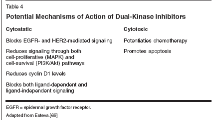 The inhibition of tyrosine kinase activity is another strategy for targeting EGF receptor pathways in the treatment of cancer. Small-molecule tyrosine kinase inhibitors (TKIs) have a range of activity, with some specific for a single receptor kinase and others equally active against several receptors.[ 51] Tyrosine kinase inhibitors that are specific for EGFR, eg, gefitinib (Iressa) and erlotinib (Tarceva), have shown only limited efficacy as monotherapies for breast cancer in the preclinical and clinical settings, suggesting that EGFR does not drive tumor growth.[52-54] Dual-kinase inhibitors are a new generation of TKIs that can block signal transduction through both EGFR and HER2 (Table 4). These TKIs inhibit the growth and survival of tumor cells by reducing both MAPK and PI3K signaling (Figure 2).[55,56] Lapatinib, a member of this class of TKIs, has shown promising activity in preclinical and early clinical investigations. In clinical trials lapatinib induced apoptosis and caused growth arrest of tumors that overexpressed HER2 or EGFR.[57] Lapatinib is a reversible inhibitor, and EKB-569 is another dual-kinase inhibitor that irreversibly inhibits the kinase activity of EGFR and HER2; however, the clinical significance of irreversible inhibition has not yet been determined.[51] The potential advantages of dualkinase inhibitors are that they inhibit both ligand-dependent and ligand-independent signaling, they can potentially overcome resistance to trastuzumab in tumors that develop compensatory mechanisms, and they appear to have synergy with chemotherapy.
