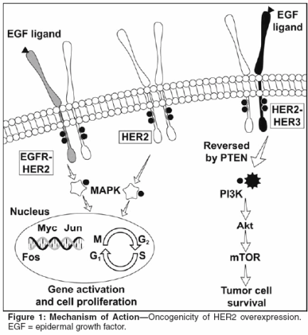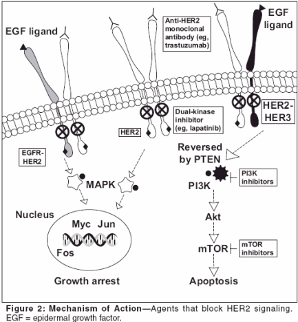 Gene therapy strategies for targeting EGF receptor activity aim at blocking the transcription, translation, and maturation of members of EGF receptor transcripts or proteins.[2] Among the agents in development are the adenovirus type 5 early region 1A gene product,[64] triplex-forming oligonucleotides, antisense oligonucleotides, and ribozymes.[65-67] Further experience with these agents may lead to novel strategies that significantly reduce HER2 signaling. Determinants of Clinical Response to Anti-HER2 Agents The clinical benefits of anti-HER2 agents may not be observed in all HER2-positive patients. For example, trastuzumab monotherapy produces an objective response in about a third of patients with HER2-positive disease and clinical benefits in almost half the patients who overexpress HER2.[68] These responses are higher when trastuzumab is used in combination with chemotherapy; objective responses were observed in 50% of patients. Recent studies suggest that there may be a correlation between the decrease in serum concentration of HER2 between 2 and 4 weeks after the start of trastuzumab- based treatment and progression- free survival.[69] The predictive value of serum HER2 levels should be investigated further. It is important to understand the molecular mechanisms that confer resistance to trastuzumab so that patients with disease that will not respond to the therapy are not exposed to its potential adverse effects.[32] Some HER2-positive tumors may have intrinsic resistance to trastuzumab and other anti-HER2 agents, and others may have acquired resistance, ie, they may have developed compensatory mechanisms (discussed in greater detail in the next section). Ongoing research indicates that the intrinsic resistance of tumor cells to trastuzumab may have a number of causes. An in vitro study showed that primary resistance to trastuzumab could stem from a masking of membrane proteins by a membraneassociated mucin.[70] This masking is thought to result in decreased accessibility to and lack of activation of HER2.[70] Evaluation of a HER2- overexpressing breast cancer cell line after exposure to trastuzumab showed an association between downregulation of p27kip1 levels and secondary resistance.[71] Loss or mutation of the tumor suppressor gene PTEN is another important cause of tumor-cell resistance to trastuzumab.[32,72] A retrospective analysis of breast carcinomas found that the responses to trastuzumab-based therapy were significantly poorer in patients with PTEN-deficient tumors than in those with normal PTEN expression.[32] A recent study has elucidated the role of PTEN in increasing sensitivity to HER2 blockers such as trastuzumab. On binding to HER2, trastuzumab stabilizes and activates the PTEN tumor suppressor, thereby downregulating the proapoptotic PI3K/Akt signaling pathway. Thus, PTEN sensitizes tumor cells to trastuzumab, and in the absence of PTEN the antitumor effects of trastuzumab are impaired.[ 32] These findings suggest that drugs that augment PTEN activity may sensitize tumors to trastuzumab. Combinations of HER2 blockers and PI3K inhibitors (once these are commercially available) may have greater efficacy. The mammalian target of rapamycin (mTOR) kinase, which is an important downstream mediator of the PI3K/Akt pathway, is another potential target for overcoming resistance to trastuzumab. The greater proapoptotic activity of PI3K in the absence of PTEN can be attenuated by inhibiting the downstream mediator, mTOR. The addition of mTOR inhibitors, such as sirolimus (rapamycin [Rapamune]) and temsirolimus, may help overcome resistance to trastuzumab in tumors that lack PTEN.[73]Optimizing Outcomes in Breast Cancer: Molecular Rationale The use of agents that target HER2 has greatly increased survival in patients with HER2-positive breast cancer. The use of anti-HER2 agents is now considered the standard of care for patients with HER2-positive disease, but many questions about the appropriate use of these agents remain to be resolved in clinical trials: