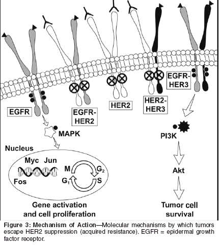 Clinical Implications This article outlines several hypotheses for the growth of HER2-positive tumors despite HER2 suppression. Based on the molecular rationale, we have proposed strategies to overcome the intrinsic resistance and compensatory mechanisms responsible for the limited response to HER2 suppression. An understanding of the molecular basis for tumor growth will allow tailored combinations of targeted therapies that can be used in combination with chemotherapy to potentially improve outcomes. Combining non- cross-resistant anti-HER2 drugs that act at different sites on the receptor may enhance the efficacy of both agents. For example, in the case of a patient presenting with metastatic breast cancer that is positive for both HER2 and EGFR, a HER2 blocker (eg, trastuzumab) and a dual-kinase TKI, such as lapatinib, may be effective. This combination can inhibit the signaling pathways mediated by both receptors by different mechanisms of action, resulting in substantial synergy. The toxicity profile of potential combinations should also be considered in making treatment decisions. For example, trastuzumab has been associated with cardiotoxicity when administered with anthracycline-based therapy.[104,105] Newer formulations of anthracyclines with reduced cardiotoxicity may provide additional treatment options for patients. The potential treatment strategies suggested in this article are theoretical and proposed based on preclinical data and the molecular mechanism of HER2- mediated signaling, as well as the mechanisms of action of potential therapeutic agents or combinations of agents. The clinical efficacy of these combinations is being tested in ongoing trials. Additional well-controlled trials should also be conducted to test the strategies proposed here. Data collected by registHER, the prospective, longitudinal study of women with HER2-positive metastatic disease, will also allow greater insight into the molecular and clinical characteristics of the tumor, as well as patient-specific factors, that are required for optimal outcomes.[ 106] In this article we suggest that EGFR or PTEN may play a role in the development of resistance to anti-HER2 agents. Other molecules, (eg, the insulin- like growth factor) or changes in cell cycle control (eg, the loss of p27- kip1) may also play a role in resistance to HER2 suppressors. A complete understanding of the molecular mechanisms of resistance will lead to the design of clinical trials of agents that target specific molecules. In the meantime it is common to continue the use of a HER2 suppressor and change the chemotherapy regimen in patients with metastatic breast cancer. Conclusions HER2 signaling plays a crucial role in the proliferation of epithelial cancers and is a significant target for pharmacologic intervention. Monoclonal antibodies and small-molecule TKIs to HER2 have shown antitumor activity as single agents and in combination regimens in patients with metastatic breast cancer. There is evidence, however, that HER2-positive tumors can grow despite HER2 inhibition. In the absence of data from clinical trials, understanding the molecular basis of the disease and the results of preclinical studies provides clues on strategies to optimize the outcomes in patients with breast cancer. In general, HER2-positive tumors continue to express HER2; the continued suppression of HER2 is therefore warranted even after disease progression. Tumor growth may result from compensatory mechanisms for HER2 suppression, and additional strategies to block these pathways should be considered. Clinical trials that address many of these questions are ongoing; the results of these trials will shed light on ways of improving patient outcomes with anti-HER2 therapies. Please visit our website at http:// www.curatiocme.com/OptimizingOutcomes/ to access the posttest and evaluation form, and to download a certificate of participation for this activity (monograph and CD-ROM). For CME questions, please contact karen.wetzel@curatiocme.com
